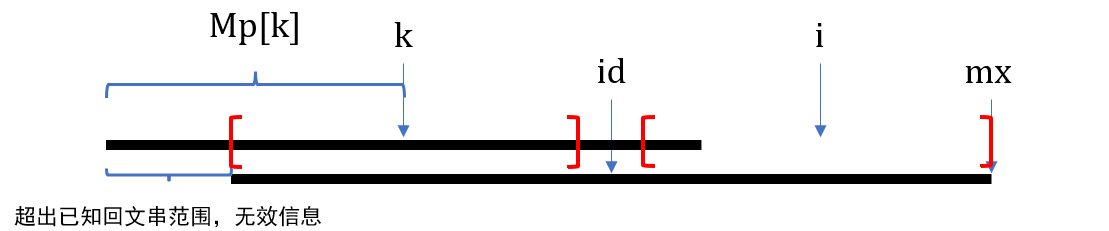 以k 为中心延展超出当前(id,mx) 回文串的部分,是不能提供任何信息的,我们不知道(id,mx) 串的左右是什么样子,因此我们只能得到k 或i 为中心,延展mx−i 长度的部分(即红框部分)一定是回文串。