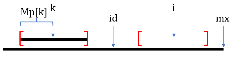 综上,id<i<mx 时,依靠对称点k=2⋅id−i ,我们得知以i 为中心一定能够沿伸min(Mp[k],mx−i) 长度的回文串,接着min(Mp[k],mx−i) 长度继续向外沿伸判断回文串即可。
