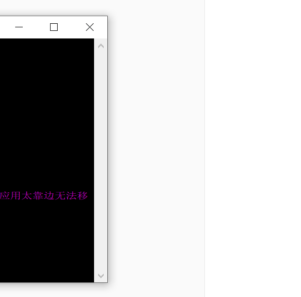 【工具】Windows中应用太靠边无法移动的解决方法 更新于 2022-11-07 分类于 工具 阅读次数: 本文字数: 138 阅读时长 ≈ 1 分钟 偶尔会遇到应用程序在电脑边缘只露一个边框导致无法移动的情况,解决方法如下。 出现下图这种情况,首先选中该软件,可以从任务栏点击图标,也可以按下Alt后不断按tab直到选中该应用: 然后按下Alt+space: 鼠标点击移动或按下键盘M,使用上下左右方向键就可以移动这个应用的位置了!